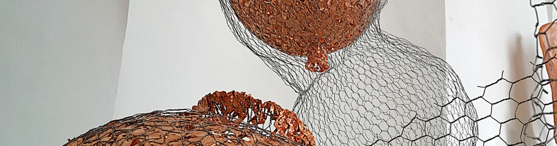 Die Rauminstallation ist von Hand aus Metallgewebe (verzinktes 6eck Gewebe) modelliert. Die Installation besteht aus zwei Grundformen, kugelähnliche Körper (30-40 cm Durchmesser), die mit Blattkupfer belegt sind. Körper, die durchdringen und verdaut werden wollen. Die zweite Form ist ein aus Metallgewebe modellierter langer Schlauch mit Verdickungen, eine Art Darm (ca.100 m lang). Überdimensional, transparent, mit leuchtendem flüchtigen Blattkupfer. Diese Installation ist für den Innenraum konzipiert, sie schwebt und liegt im Raum (3x3x3m). Auf den Fotos ist ein kleiner Ausschnitt von durchdringen 7 zu sehen.