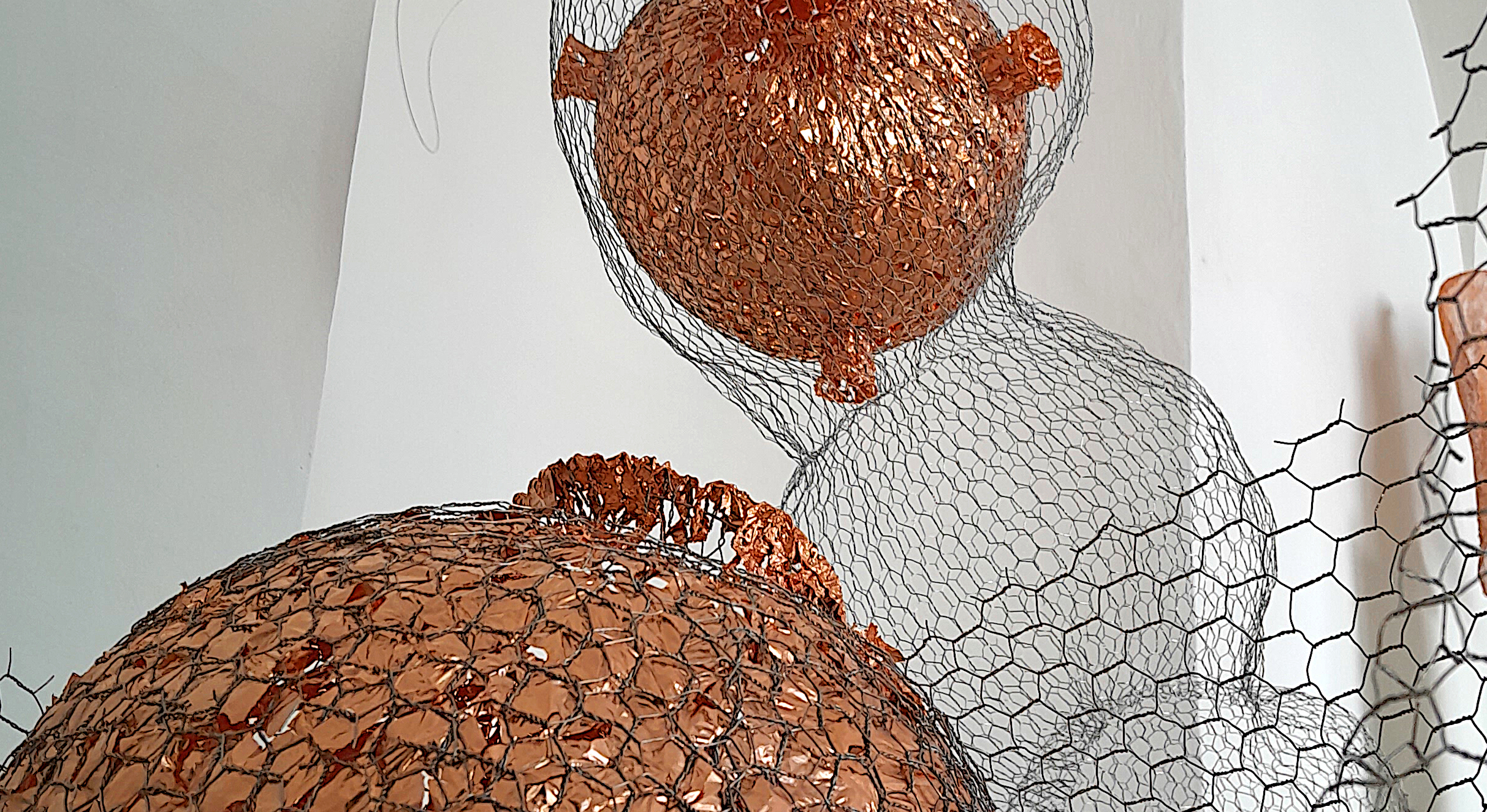 Die Rauminstallation ist von Hand aus Metallgewebe (verzinktes 6eck Gewebe) modelliert. Die Installation besteht aus zwei Grundformen, kugelähnliche Körper (30-40 cm Durchmesser), die mit Blattkupfer belegt sind. Körper, die durchdringen und verdaut werden wollen. Die zweite Form ist ein aus Metallgewebe modellierter langer Schlauch mit Verdickungen, eine Art Darm (ca.100 m lang). Überdimensional, transparent, mit leuchtendem flüchtigen Blattkupfer. Diese Installation ist für den Innenraum konzipiert, sie schwebt und liegt im Raum (3x3x3m). Auf den Fotos ist ein kleiner Ausschnitt von durchdringen 7 zu sehen.